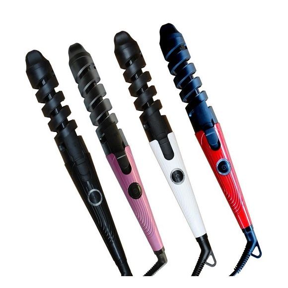 Плойка для создания спиральных локонов. Очень удобная плойка специально сконструированная для создания идеального спирального локона. Благодаря специальному пресс-механизму с помощью данной плойки вы создадите тугие, крупные идеальные локоны. Титаново -турмалиновый желоб направляет волосы таким образом, чтобы предотвратить спутывание и наложение. А так же позволяет нагревать прядь с 3х сторон, создавая тем самым более упругую фиксацию и 3D объем. Ненагревающийся наконечкик обезопасит вас от обжигания.